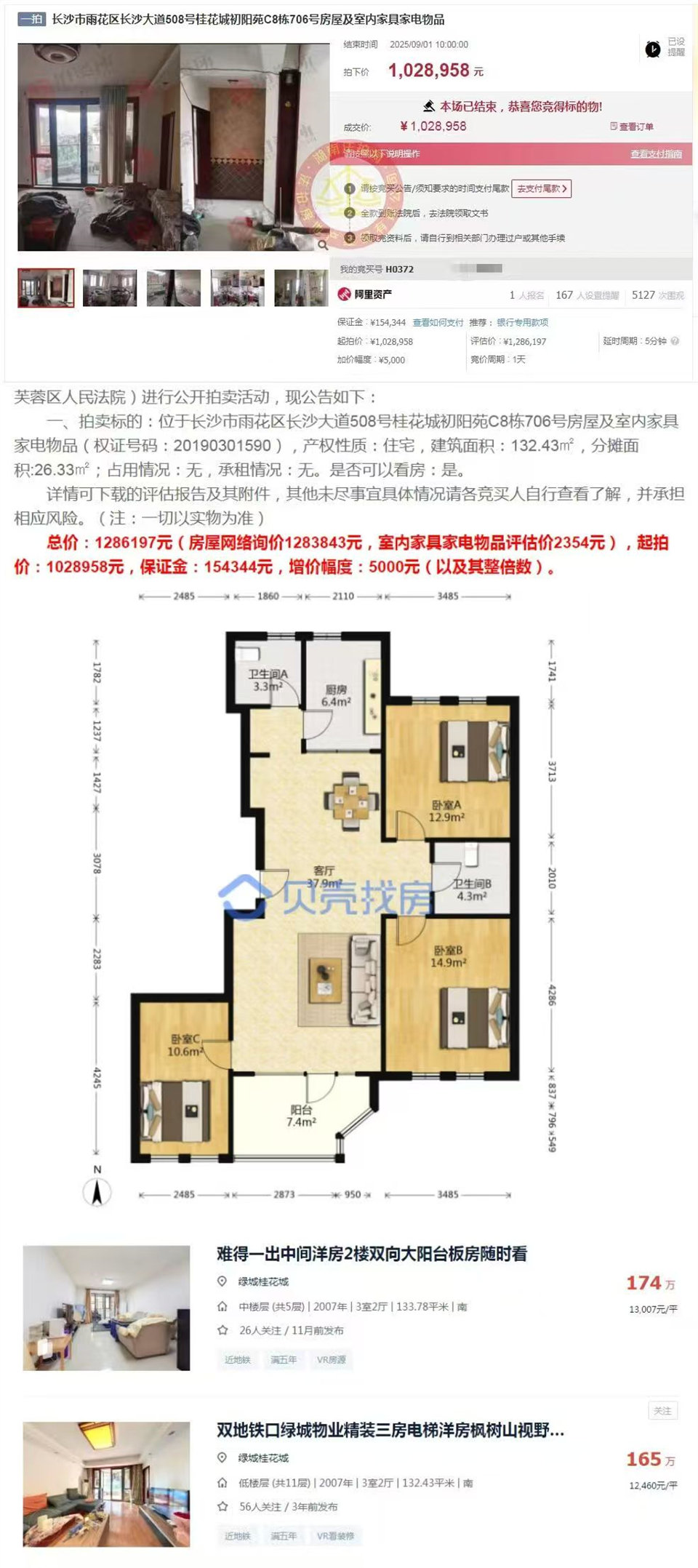 再講下拍房緣分,H阿姨是我公司(湖南法拍網法拍房地產經紀有限公司)第242個VIP客戶,準備看法拍房,先關注的收6-8個點同行,后面覺得太貴了沒選擇,然后她女兒就刷到我了,就來我們公司了解了,選擇了我們。5月份簽的約,服務了4個月,推薦看了不少,參拍了都有7套房子,但是都沒拍到,幾次都是老二,勸一勸也還會加,可能也早拍到了,但是我們覺得撿漏空間小了,就不勸了,寧愿多拍幾套。前幾天就推薦了這個桂花城,本來覺得超預算不太想拍的,但我們覺得房子確實不錯就去看了,拍了照片視頻發(fā)到群里,就還是有興趣,然后臨結束前一天還是去小區(qū)看了下,還看了下中城麗景香山的露臺房,然后考慮了下晚上決定拍,當天晚上就報名了,第二天早上就底價成交了,真的就是緣分。