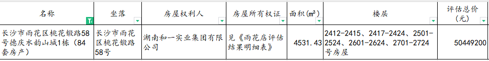 因湖南和一實業(yè)集團有限公司破產(chǎn)重整需要依法拍賣處置的相關(guān)資產(chǎn):長沙市雨花區(qū)桃花鍛路58號德慶水韻山城1棟(84套房產(chǎn)), 具體為2412-2415、2417-2424、2501-2524、2601-2624、2701-2724號房屋。以上資產(chǎn)的詳細清單及其價值請參見國眾聯(lián)資產(chǎn)評估土地房地產(chǎn)估價有限公司湖南分公司關(guān)于對湖南和一實業(yè)集團有限公司名下位于長沙市雨花區(qū)桃花鍛路58號德慶水韻山城1棟房地產(chǎn)市場價值(補充)評估說明書及相應的《評估結(jié)果明細表》。